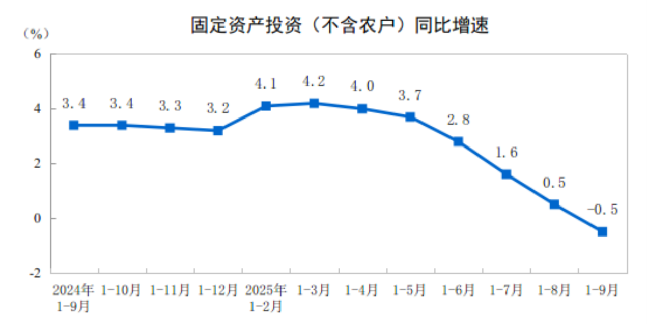 2025年1—9月份,全国固定资产投资(不含农户)371535亿元,同比下降0.5%(按可比口径计算,详见附注7)。其中,民间固定资产投资同比下降3.1%。从环比看,9月份固定资产投资(不含农户)下降0.07%。