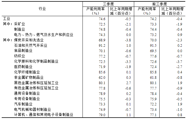 分三大门类看,2025年三季度,采矿业产能利用率为72.5%;制造业产能利用率为74.8%;电力、热力、燃气及水生产和供应业产能利用率为74.3%。