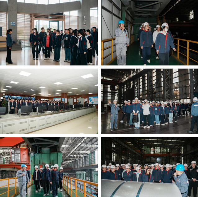 在各区域负责人的引导下,太原理工大学师生团队开启实地参观环节,全方位感受晋钢的生产实力与人文关怀。走进智能管控中心,直观感受晋钢在工业智能化领域的探索成果。从烧结主控室,再到炼铁 1#2# 高炉主控室与炉前平台,师生们近距离观察钢铁生产核心环节,随后又参观了热轧厂及冷轧厂,每到一处,负责人均结合生产实际解答专业疑问,让学生们对冶金工程专业的应用场景有了具象认知。参观期间,集团严格落实安全管理要求,各生产参观区域安排安全管理人员全程陪同,确保参观安全有序。