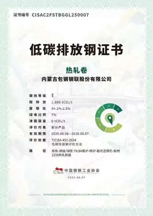 2024年,包钢集团正式发布“BGreeREX”“BGreeEX”两大绿色低碳品牌,将LCA数据与产品标识深度融合,推动“绿钢”从生产端迈向市场端。此次热轧卷获颁低碳排放钢证书,正是品牌战略落地的重要标志,也展现出包钢集团在绿色产品体系构建上的系统布局。这一系统化的减碳路径,不仅提升了产品的绿色属性,也为包钢集团打造绿色品牌奠定了坚实基础。