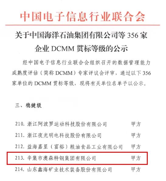 近日,中国电子信息行业联合会正式公布2025年度最新一批DCMM(数据管理能力成熟度)认证单位,澳森特钢凭借其在数据管理体系建设方面的扎实成效,成功通过认证并荣获甲方企业DCMM三级(稳健级)证书。这标志着澳森特钢在数据治理和数字化转型领域迈出了坚实一步,其数据管理能力获得国家权威标准认可。