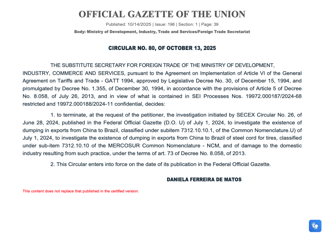 2025年10月14日,巴西官方发布公告,由于申请人撤诉,正式终止对华轮胎用钢帘线反倾销调查,并作出无措施结案。这一里程碑式结果,标志着这场历时471天的全球第一起钢帘线反倾销调查应诉终获全胜,兴达作为行业领军企业,不仅为自身保住了关键海外市场,更以行业担当为中国钢帘线产业筑牢国际贸易防线。