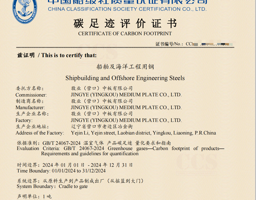 近日,敬业营口中板成功完成对船舶及海洋工程用钢系列产品的碳足迹评价,并正式获得由中国船级社质量认证有限公司颁发的产品碳足迹评价报告与证书,不仅标志着公司在绿色制造与可持续发展领域取得了突破性进展,更为公司获得船舶海工项目优先供货资格提供有力保障。