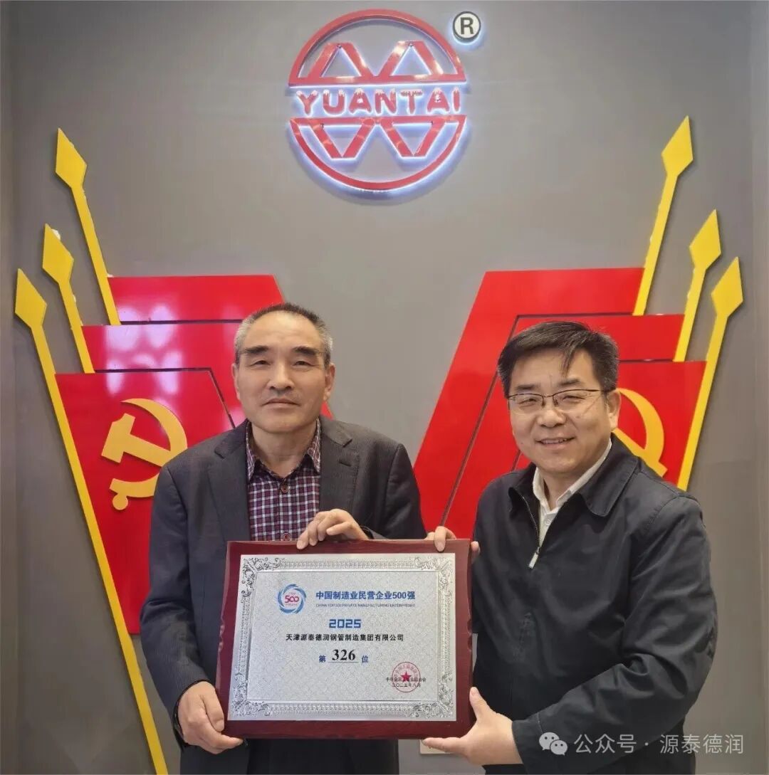 近日,天津源泰德润集团迎来重要时刻——天津市工商联副主席于为忠莅临集团参观指导,并向集团颁发两项沉甸甸的荣誉证书:“中国制造业民营企业500强”第326位、“中国民营企业500强”第491位。此次授牌不仅是对源泰德润综合实力的认可,更彰显了政企同心、共促高质量发展的坚定决心。