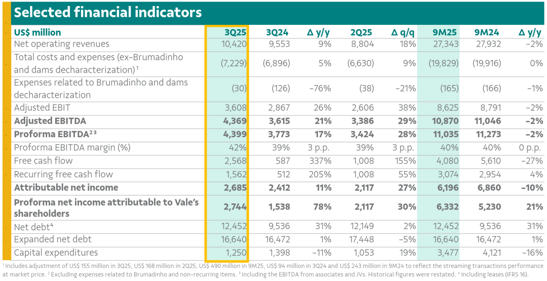 淡水河谷于今日发布了2025年第三季度财务报告。