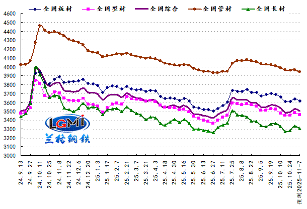 2025年第44周(2025.10.27-10.31)兰格钢铁全国绝对价格指数为3525元,较上周上升1.1%,较去年同期下降7.9%;其中,兰格钢铁长材绝对价格指数为3334元,较上周上升1.7%,较去年同期下降9.7%;兰格钢铁型材绝对价格指数为3480元,较上周上升0.8%,较去年同期下降6.7%;兰格钢铁板材绝对价格指数为3637元,较上周上升0.8%,较去年同期下降6.1%;兰格钢铁管材绝对价格指数为3963元,较上周上升0.2%,较去年同期下降9.8%。