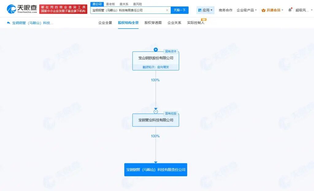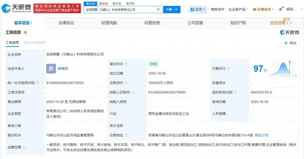 天眼查信息显示,2025年10月28日,宝钢钢管(马鞍山)科技有限责任公司成立,法定代表人为薛建国,注册资本10亿人民币,经营范围包括钢、铁冶炼,钢压延加工,货物进出口等。股权全景穿透图显示,该公司由宝钢管业科技有限公司全资持股,后者为宝钢股份全资子公司。新公司法定代表人薛建国,担任经理、董事,钱建国担任财务负责人。