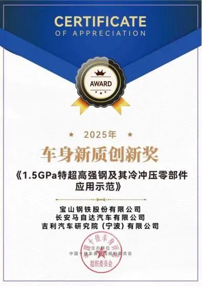 宝钢《1.5GPa特超高强钢及其冷冲压零部件应用示范》荣获2025年车身新质创新奖
