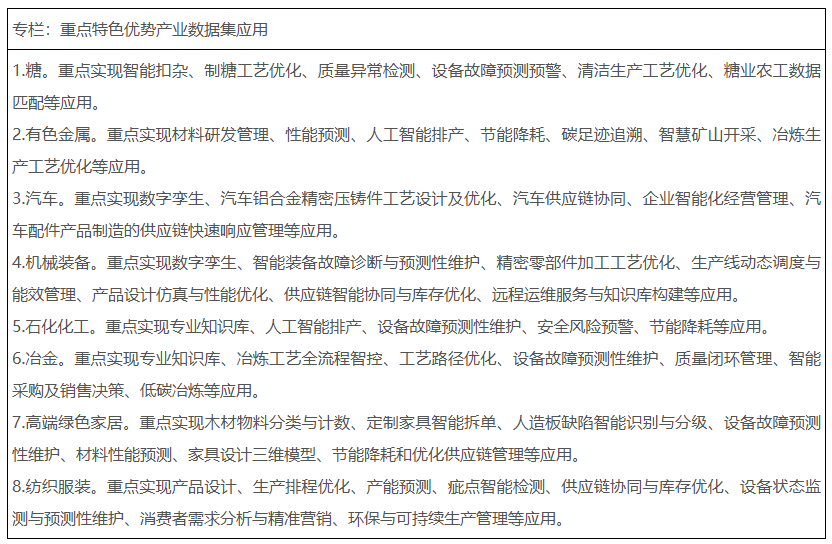 聚焦糖、有色金属、汽车、机械装备、石化化工、冶金、高端绿色家居、纺织服装等广西重点特色优势产业,鼓励其他产业积极探索,坚持场景需求和问题导向,梳理数据集应用需求。