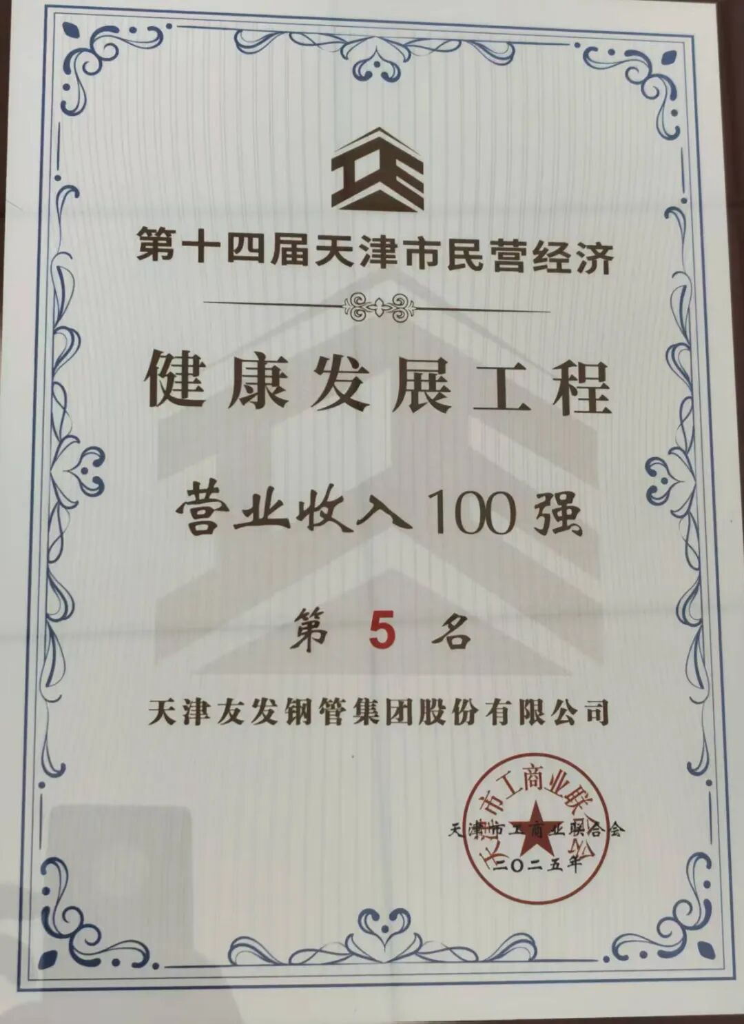 会议发布了第十四届天津市民营经济“健康成长工程”百强榜单和研究报告,天津友发钢管集团股份有限公司荣获“营业收入100强”第5名。