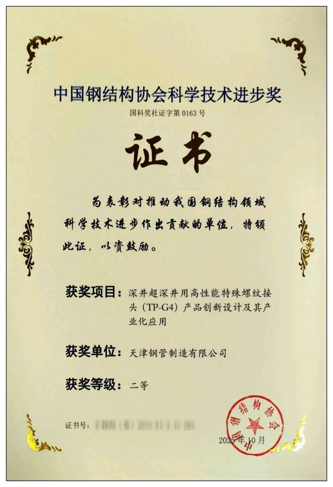 日前,从中国钢结构协会获悉,天津钢管提报的“深井超深井用高性能特殊螺纹接头(TP-G4)产品创新设计及产业化应用”,荣获中国钢结构协会科学技术进步二等奖,标志着公司在高端石油套管连接技术领域取得重大突破,彰显了公司在专业管材领域研发的实力。