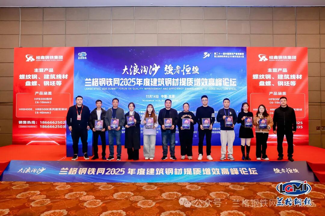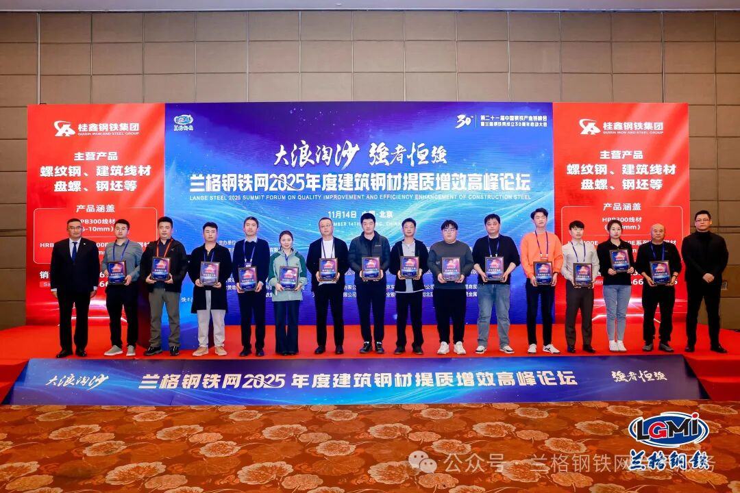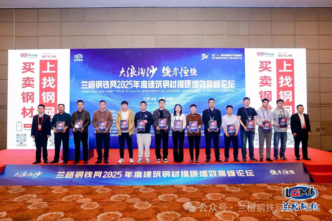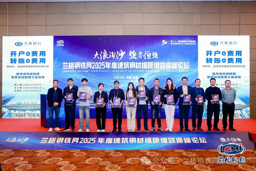 在本次大会的多个颁奖环节中,兰格河南会员单位凭借卓越的综合实力和良好的市场口碑,斩获多项重要荣誉:在建筑钢材领域,山西鼎珵贸易有限公司、河南安信钢铁销售有限公司、郑州亿仁科贸有限公司、河南济钢钢材销售有限公司、郑州腾跃建材有限公司共同入选“兰格钢铁网2025年度金牌供应商建筑钢材百强”。