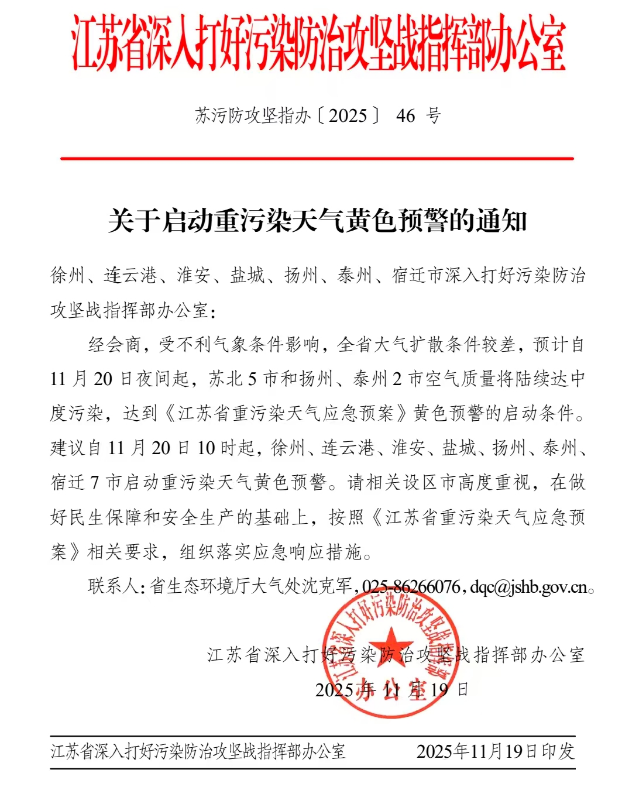 江苏发布通知:11月20日10时起,徐州、连云港、淮安、盐城、扬州、泰州、宿迁7市启动重污染天气黄色预警