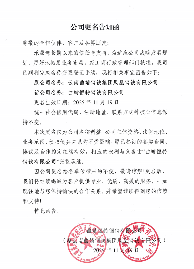 - 告知函!云南曲靖钢铁集团凤凰钢铁有限公司正式更名为曲靖恒特钢铁有限公司2025/11/20