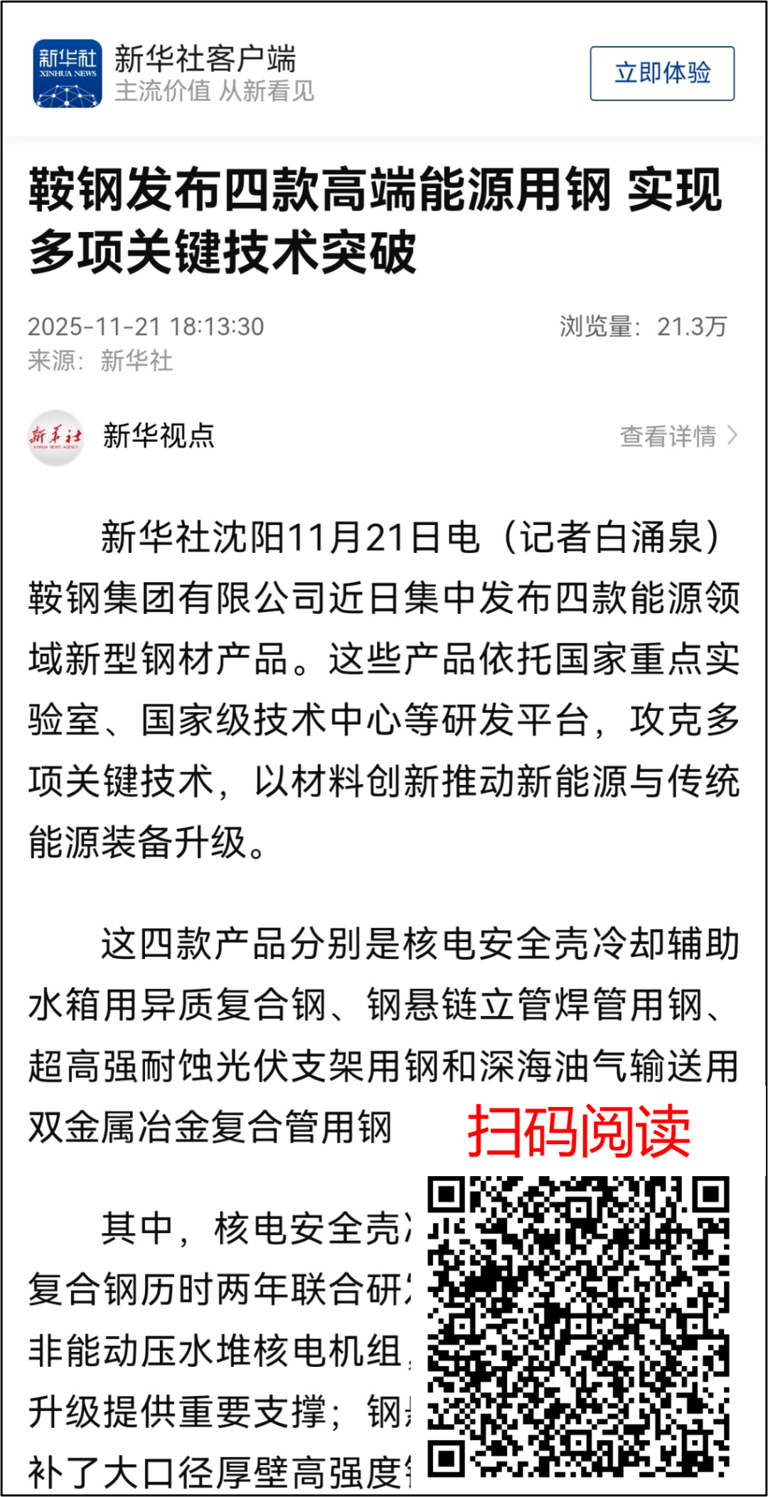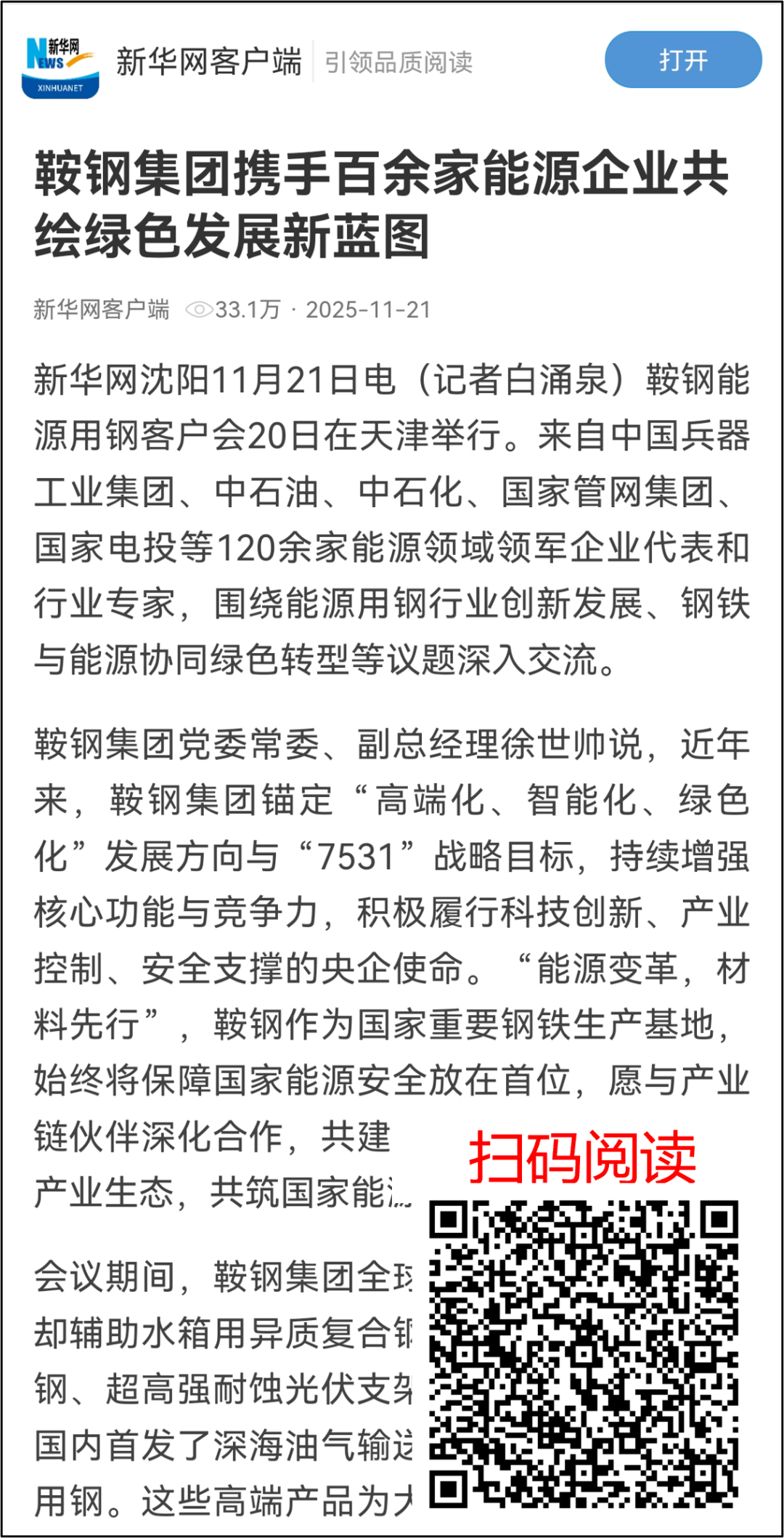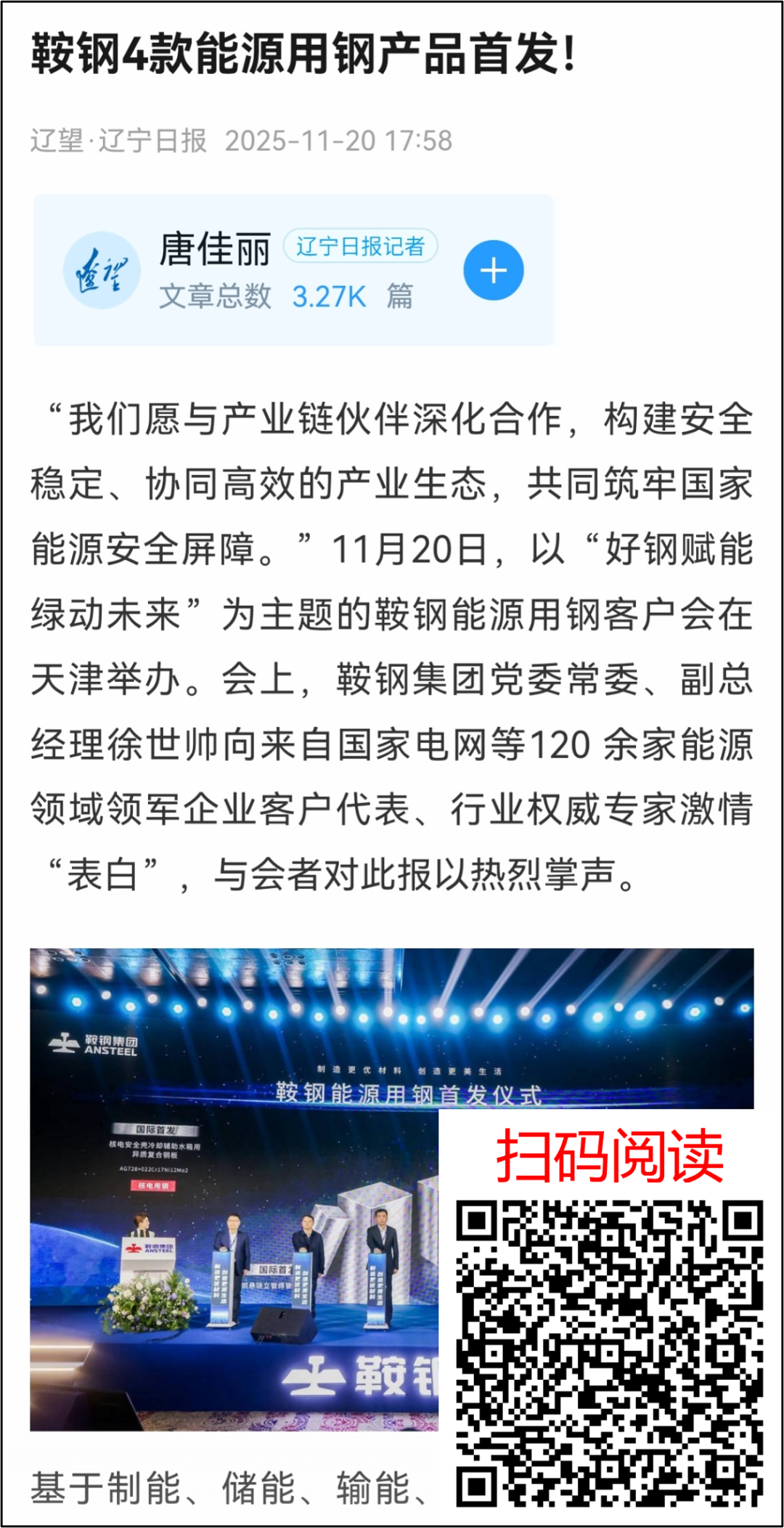 - 多家主流媒体高度关注鞍钢能源用钢客户会 首发4款能源用钢产品成行业焦点!2025/11/25