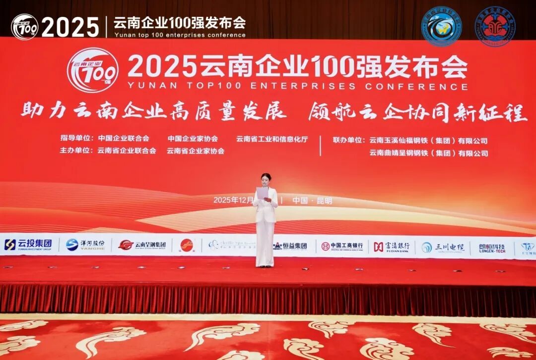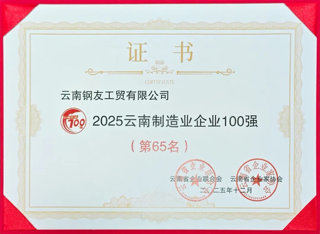 2025年12月6日,由云南省企业联合会、云南省企业家协会举办的"2025云南企业百强发布会"在昆明海埂会堂召开,云南钢友凭借在区域制造业中的优质服务与持续的产业贡献,再度实力入选,位列云南制造业企业100强榜单65名,这已是云南钢友连续12年蝉联该权威榜单。