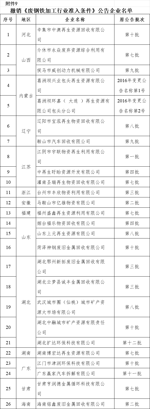9.撤销《废钢铁加工行业准入条件》公告企业名单