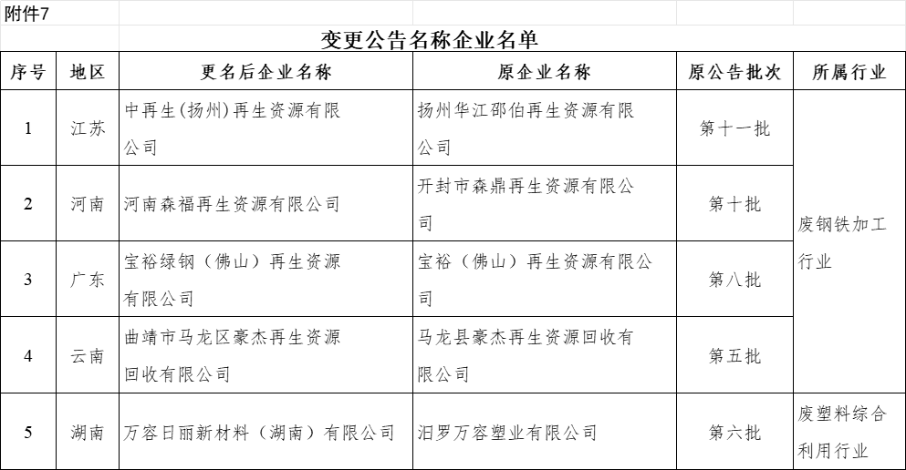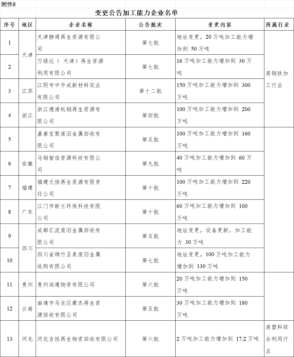 根据《废钢铁加工行业准入条件》等规范条件及相关公告管理办法规定,经专家审核、现场核查及网上公示等程序,现将符合《废钢铁加工行业准入条件》企业名单(第十三批)、符合《废铜铝加工利用行业规范条件》企业名单(第二批)、符合《废纸加工行业规范条件》企业名单(第四批)、符合《废塑料综合利用行业规范条件》企业名单(第九批)、符合《废旧轮胎综合利用行业规范条件》企业名单(第六批)、符合《机电产品再制造行业规范条件》企业名单(第二批),以及变更公告名称、变更公告加工能力和撤销公告的企业名单予以公告。