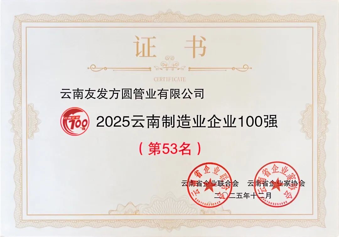 此次荣登“双榜”,既是肯定,更是鞭策。云南友发方圆将继续携手合作伙伴、客户与全体员工,以更坚定的步伐、更创新的思维、更务实的作风,努力打造西南地区最具影响力的管道制造企业!奋进新征程,展现新作为!