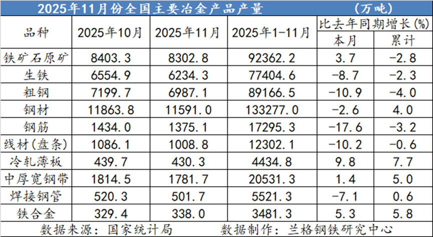 兰格追踪:2025年1-11月全国主要冶金产品产量