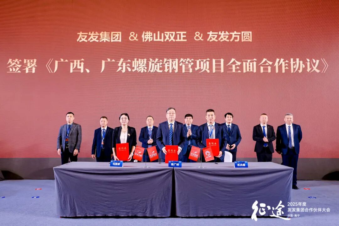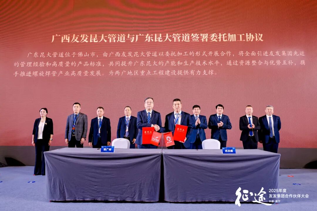 在友发集团董事长李茂津等集团相关负责人、两广地区大友发重要合作伙伴的共同见证下,友发集团总经理陈广岭先后与九江镇党委委员王若辉签约《友发集团广东南海九江基地项目》,与佛山双正投资有限公司总经理苏兵建、云南友发方圆董事长马丽波签署《广西、广东螺旋钢管项目全面合作协议》和《广西友发昆大管道与广东昆大管道委托加工协议》。这也标志着,友发集团在产能空间布局和产品矩阵完善方面不断提速,行业竞合协同发展价值生态圈不断扩大。