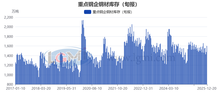据中国钢铁工业协会统计数据显示,2025年12月中旬重点钢铁企业钢材库存量为1601万吨,旬环比增加126万吨,上升8.6%;比上月同旬增加40万吨,上升2.6%;比去年同旬增加137万吨,上升9.4%。