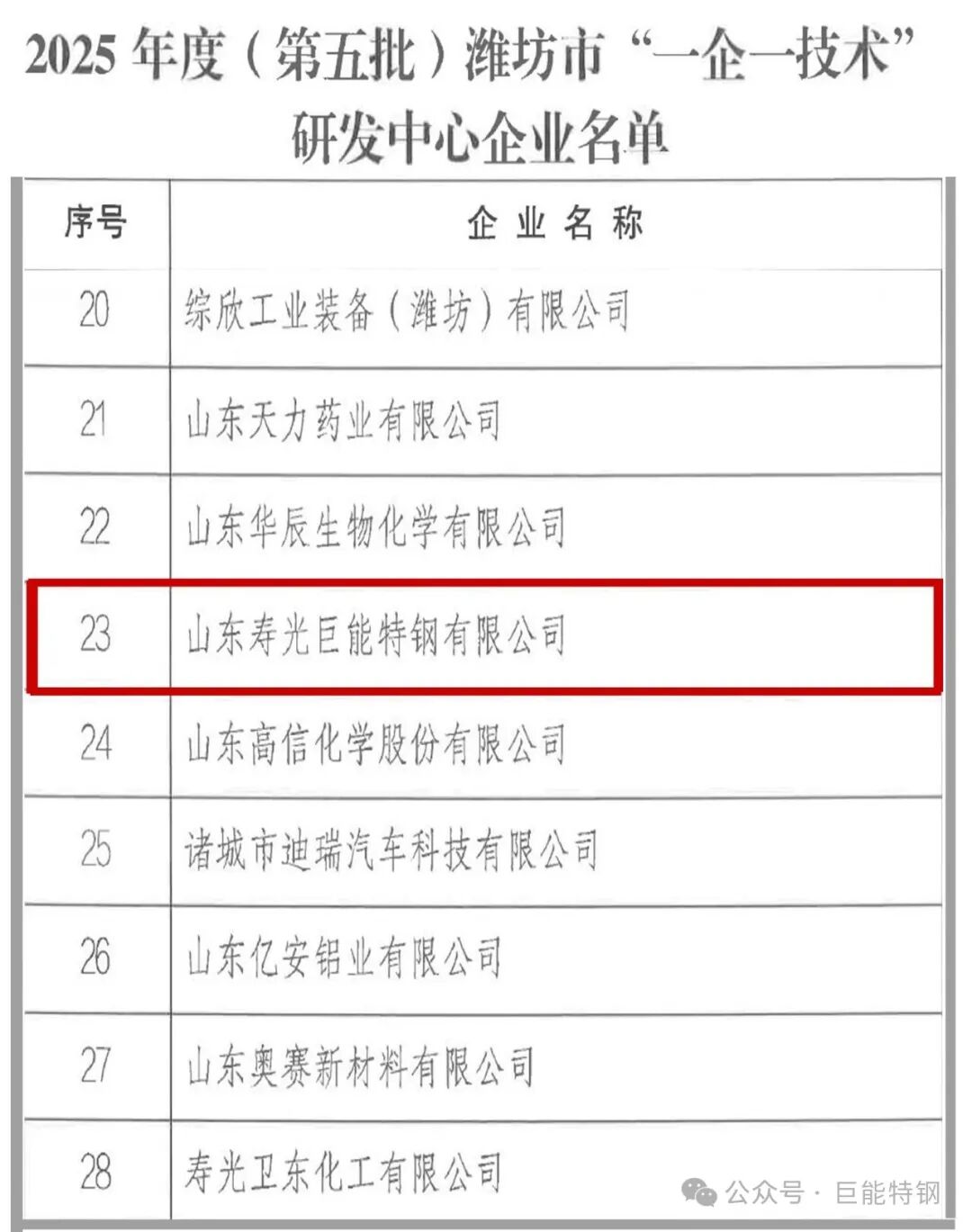 巨能特钢认定为2025年潍坊市“一企一技术”研发中心