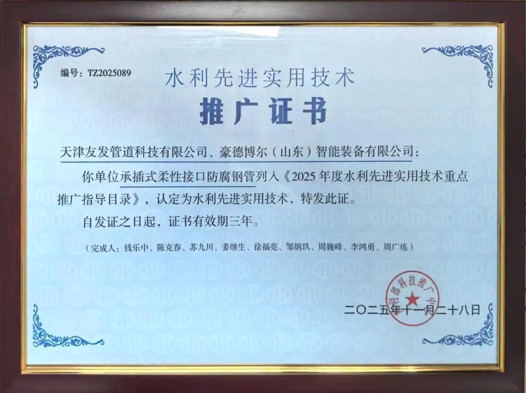 近日,水利部科技推广中心组织专家对水利先进实用技术重点推广指导目录的申报技术进行严格筛选,形成了《2025年度水利先进实用技术重点推广指导目录》,天津友发管道科技有限公司凭借“承插式柔性接口防腐钢管”卓越的技术创新性、工程实用性、经济效益优越性与绿色环保优势成功入选。这一荣誉不仅标志着该产品获得国家水利主管部门的权威认可,更意味着友发管道科技在水利工程管道领域的技术实力与产品品质已跻身行业领先水平,将为我国水利基础设施建设的提质增效与长期安全运行提供重要的产品支撑,推动管道行业的技术进步和产业升级。