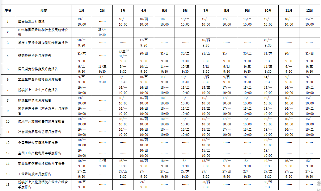 3.1月、4月、7月、10月分别发布年度、季度国民经济运行情况,3月、5月、6月、8月、9月、11月和12月发布月度国民经济运行情况。在发布国民经济运行情况新闻发布稿的同时,分别发布工业生产、能源生产、固定资产投资、房地产开发投资和销售、社会消费品零售总额等月度或累计数据情况新闻稿。