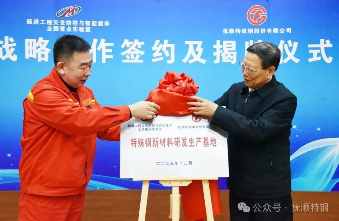 孙立国与何满潮院士共同签署了《抚顺特钢与隧道全重实验室战略合作协议》,并为“特殊钢新材料研发生产基地”揭牌。