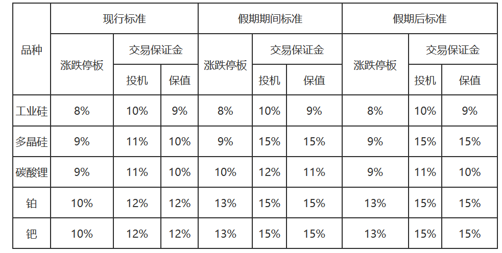 2026年1月5日(星期一)恢复交易后,在各品种期货持仓量最大的合约未出现涨跌停板单边无连续报价的第一个交易日结算时起,工业硅期货合约涨跌停板幅度及交易保证金标准维持不变;多晶硅、铂及钯期货合约涨跌停板幅度、投机交易保证金标准及套期保值交易保证金标准维持假期期间标准不变;碳酸锂期货合约涨跌停板幅度、投机交易保证金标准及套期保值交易保证金标准恢复至调整前水平。