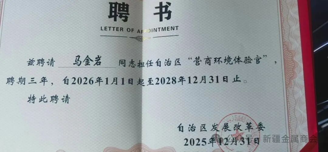 - 新疆金属材料行业商会会长马金岩被聘为自治区首批“营商环境体验官”2026/1/5