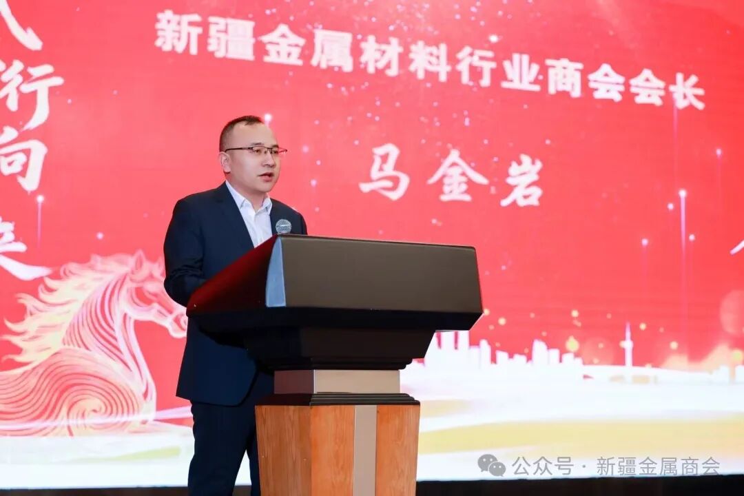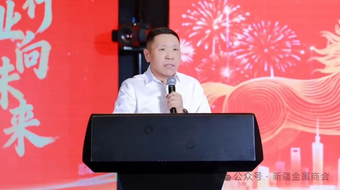 会长马金岩致辞,代表金属材料行业商会向到场的各级领导、各位企业家、全体会员致以亲切的问候和美好的祝愿!感谢大家一年来对商会工作的支持与关心。希望新的一年在自治区工商联的领导下,商会充分发挥组织引领作用,持续搭建优质交流合作平台,在钢铁贸易赛道上做强自身、深耕细作,在抱团同心征程中共享机遇、共赢未来,携手书写新疆金属材料行业更加辉煌的新篇章!
