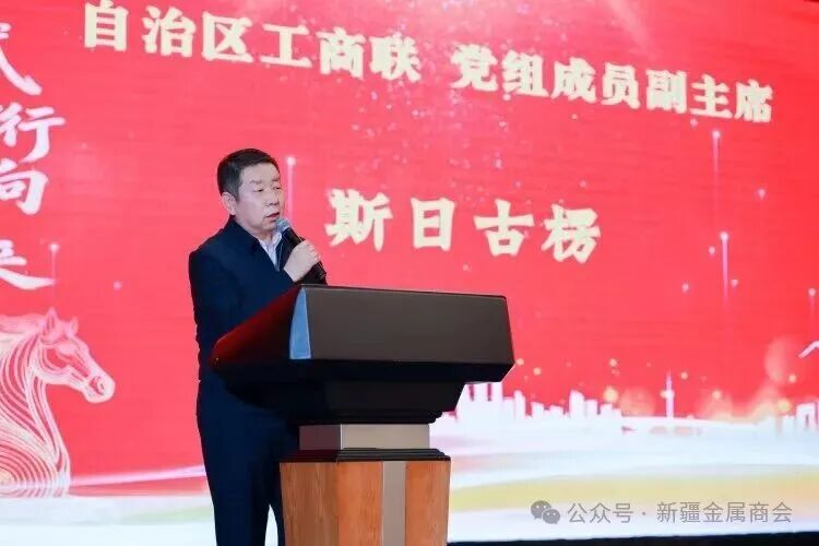 自治区工商联党组成员、副主席斯日古楞代表自治区工商联对年会的召开表示祝贺,他充分肯定了商会在过去一年取得的成绩,同时对商会未来的发展寄予厚望。希望新疆金属材料行业商会坚定弘扬优秀企业家精神,始终听党话、跟党走,不断增强商会凝聚力,团结带领会员企业紧紧抓住新疆“多重政策叠加、资源禀赋持续释放、对外贸易势头强劲”等重大机遇,加大投入、诚信经营,在新疆这片投资兴业的热土上不断发展壮大、创造辉煌业绩。