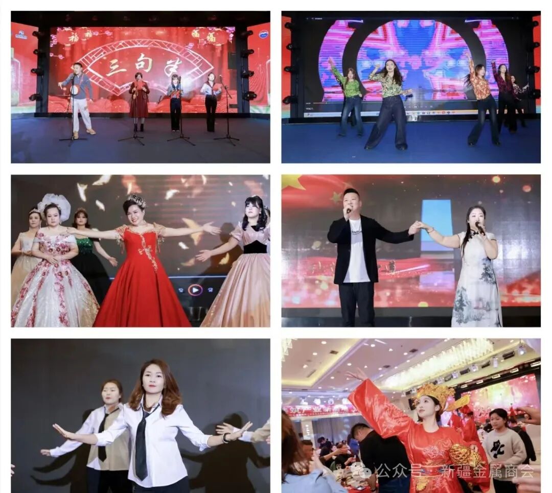商会会长单位新疆金鞍特斯国际贸易有限公司、新疆金马伟业钢铁有限公司、新疆金马弘邦投资发展有限公司、常务副会长单位喀什月勤商贸有限公司乌鲁木齐分公司、副会长单位乌鲁木齐大唐皖新商贸有限公司代表队为晚会献上精彩节目,在增添欢乐氛围的同时,也生动展现了会员企业昂扬向上的精神风貌。