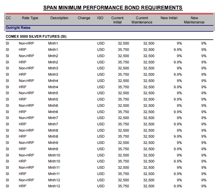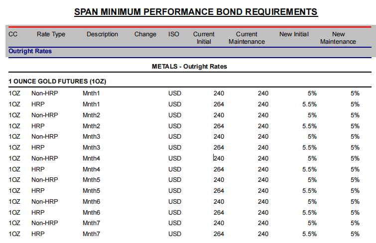 根据文件具体内容,部分非高风险组合(Non-HRP)黄金合约的保证金比例(Outright Rates)将调整为名义价值约5%,白银约为9%。