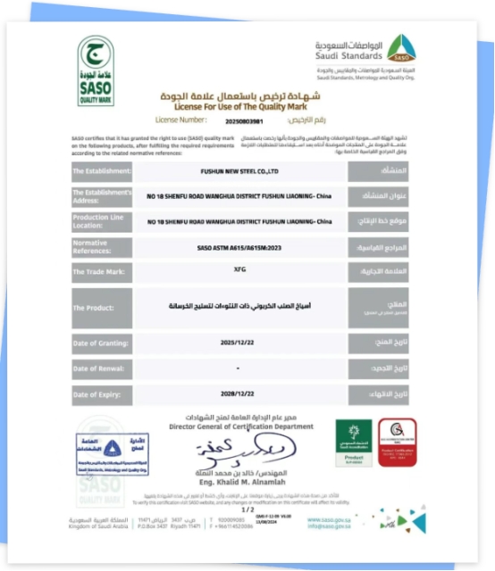 近日,抚顺新钢铁螺纹钢产品(Grade280/Grade420/Grade550)顺利通过沙特阿拉伯标准组织(SASO)权威认证,完全符合SASO ASTM A615标准核心技术要求,正式获得进入沙特阿拉伯市场的“准入通行证”,成为国内第一家取得SASO认证的螺纹钢企业。这一里程碑式成就,标志着该公司在国际化布局中迈出关键一步,为深耕“一带一路”沿线核心市场奠定坚实基础。