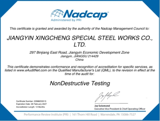 近日,江阴兴澄特种钢铁有限公司顺利通过由美国PRI组织的Nadcap-NDT(无损检测)特殊工艺认证,成功获得涡流检测与超声检测双方法认证。至此,兴澄特钢成为中国钢铁行业首家Nadcap认证细分领域覆盖最全的企业,标志着公司在热处理(HT)、钢铁冶炼(STL)、材料测试(MTL)及无损检测(NDT)四大关键特殊工艺领域均已通过国际权威认证,建立了覆盖高端特殊钢生产全流程的国际航空标准体系。