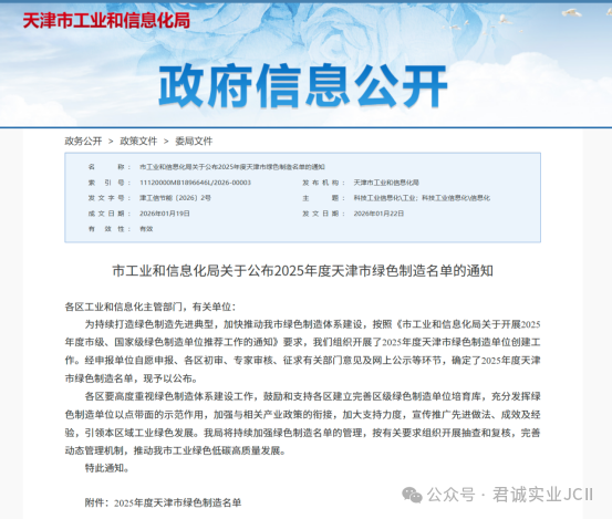 - 践行绿色发展,打造行业标杆——天津君诚管道实业集团有限公司荣获2025年天津市绿色工厂称号2026/1/26