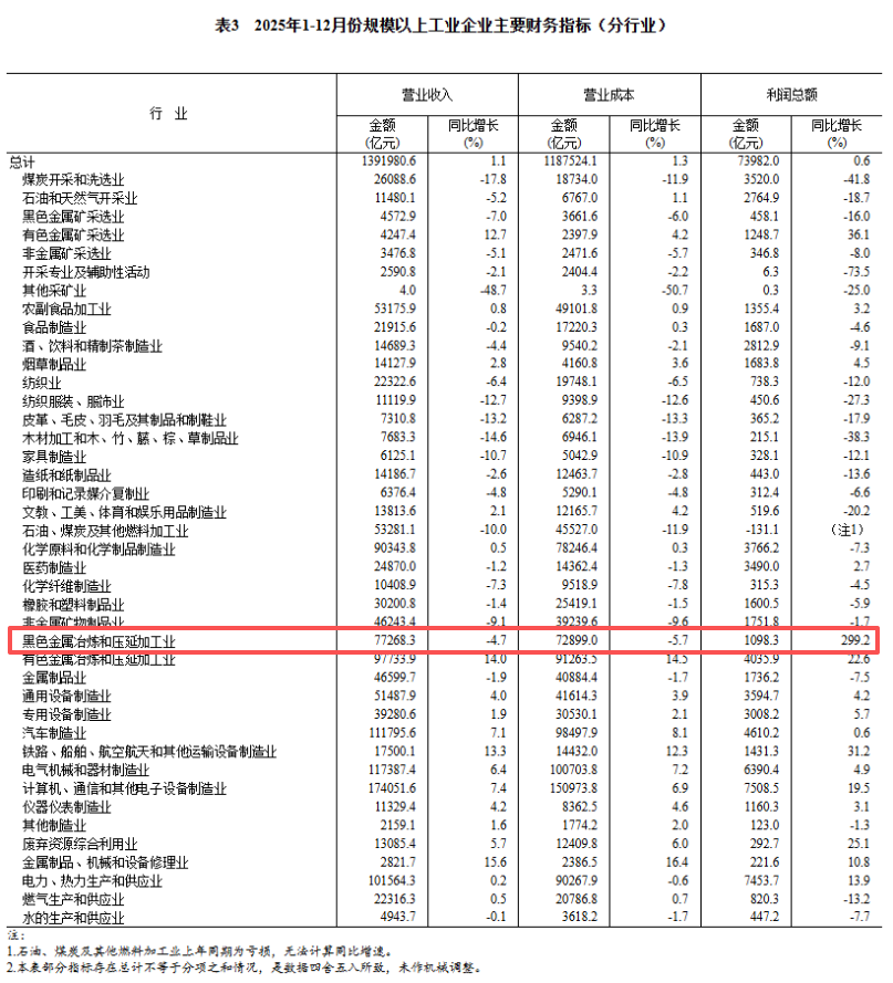 2025年,黑色金属冶炼和压延加工业实现利润总额1098.3亿元,同比增长299.2%。