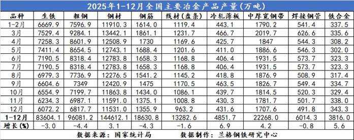 表2 2025年1-12月全国钢铁下游工业产品产量