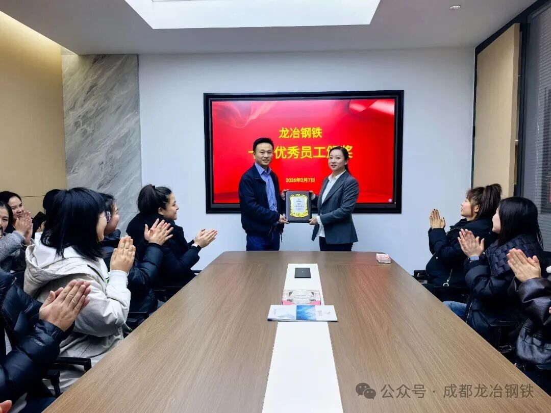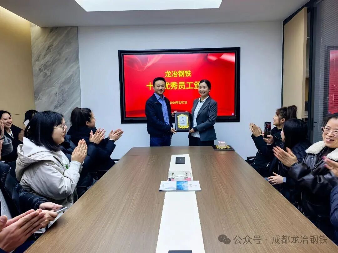 会议的高光时刻,当属“十年优秀员工”表彰环节。十年风雨兼程,十年初心不改,两名员工将最美的年华奉献给公司,与企业同成长、共发展。“十年优秀员工”评选是龙冶钢铁每年的传统惯例,龙总为她们颁发了定制的荣誉奖牌,伍万元的现金奖励,既是对她们过去十年付出的肯定,亦是激励她们再攀高峰,与公司携手奔赴下一个更加辉煌的十年。这份荣誉,是对坚守最好的褒奖,也激励着所有同仁见贤思齐,携手同行。