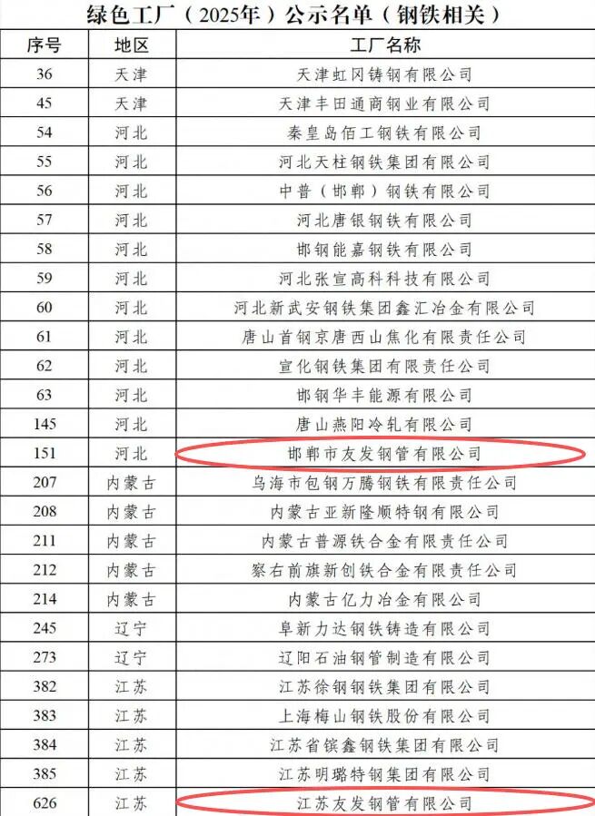 2月5日,工业和信息化部发布绿色工厂、绿色工业园区(2025年)公示名单,邯郸市友发钢管有限公司、江苏友发钢管有限公司成功入选,友发集团国家级绿色工厂阵营再添新成员。