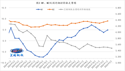 2026 年开年央行发布的金融数据交出亮眼答卷,成为实体经济复苏的强劲信号,更直接为钢材市场勾勒出明确的需求增量预期,为春节后钢市旺季行情筑牢基础。当月广义货币(M2)同比增长9%,狭义货币(M1)同比增长4.9%,人民币贷款增加4.71万亿元,社会融资规模增量达7.22万亿元并创历史同期新高,同期全国 PPI 同比下降1.4%,降幅较上月收窄0.5个百分点,且环比连续4个月上涨,工业价格的持续回暖,进一步印证实体经济需求正逐步修复。尽管当前制造用钢需求受企业观望情绪影响呈季节性走弱,但1月金融数据展现出的信贷与社融同比分化、M1增速回升、M2波动上行的结构性积极变化,叠加企业与居民端信贷意愿双升、政府与企业融资协同发力的多重信号,已为钢市需求复苏埋下伏笔,同时勾勒出基建用钢、制造业用钢、高端特种用钢三大需求增量,夯实春节后旺季需求基础,钢铁行业需求预期迎来实质性提振。