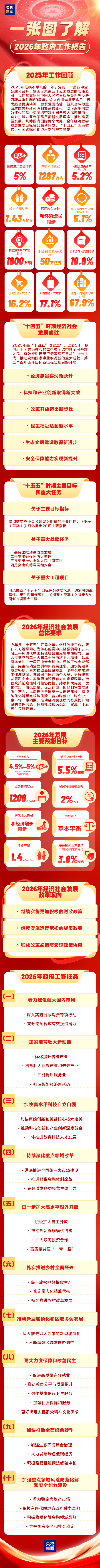 十四届全国人大四次会议5日上午在人民大会堂开幕,习近平等党和国家领导人出席开幕会,国务院总理李强向大会作政府工作报告。一张图,带你了解2026年政府工作报告。