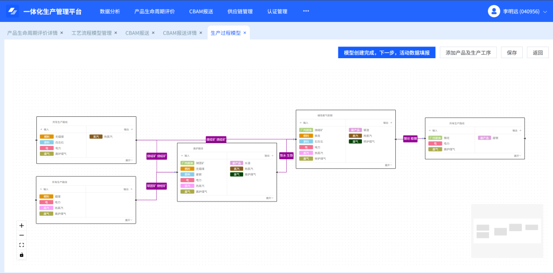 作为覆盖产品全生命周期的智能碳管控工具,平台构建了产品生命周期评价、模型管理、CBAM专项管理等七大核心模块,实现碳足迹全流程闭环管理,内置最新版Ecoinvent数据库,可完成专业核算环节,既能生成符合中钢协要求的EPD报告,也能对接欧盟CBAM申报,为产品出口破除碳壁垒提供关键技术保障;应用中,平台可高效采集生产、物流、供应链全维度数据,支持自动获取与手动填报,其自主建模功能可精准梳理碳排放分布,为减排和绿色产品开发提供决策依据。