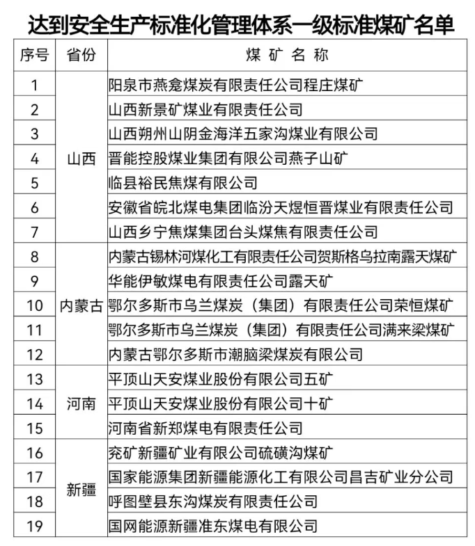 19处!安全生产标准化管理体系一级达标煤矿名单公示