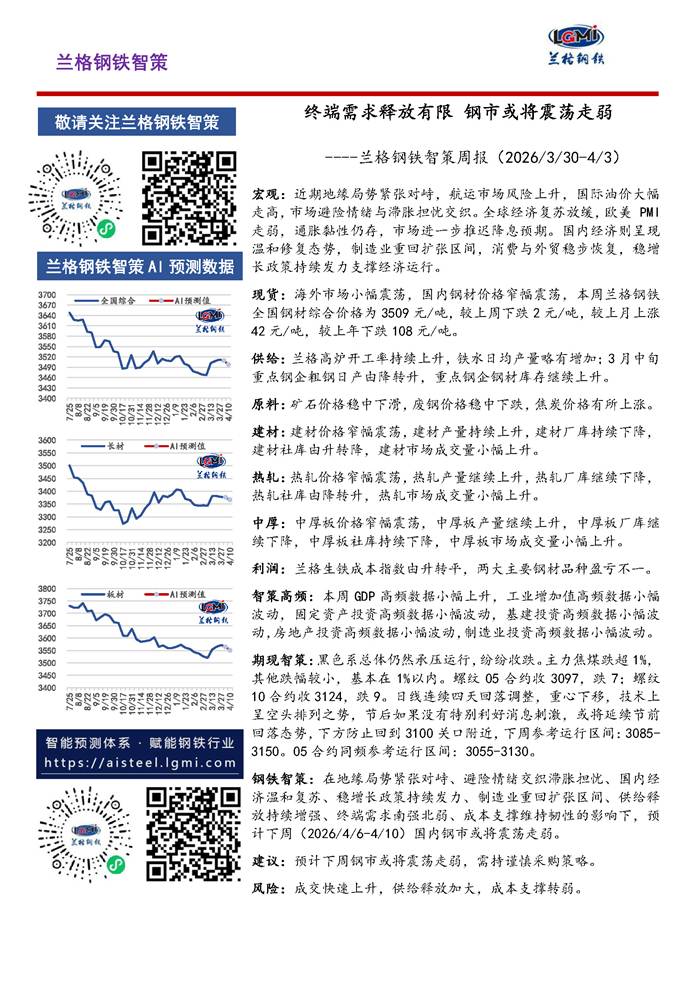 - 兰格钢铁智策周报-终端需求释放有限 钢市或将震荡走弱2026/4/3