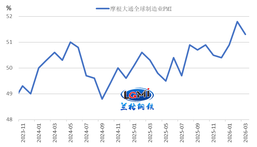 全球制造业虽处于扩张区间,但复苏动能不足,对钢材外需拉动有限。2026年3月,摩根大通全球制造业PMI为51.3%,环比回落0.5个百分点(详见图4);反映当前全球制造业呈现“扩张放缓、韧性仍在、分化加剧、成本上行”的总体格局,难以对我国出口形成强劲拉动。