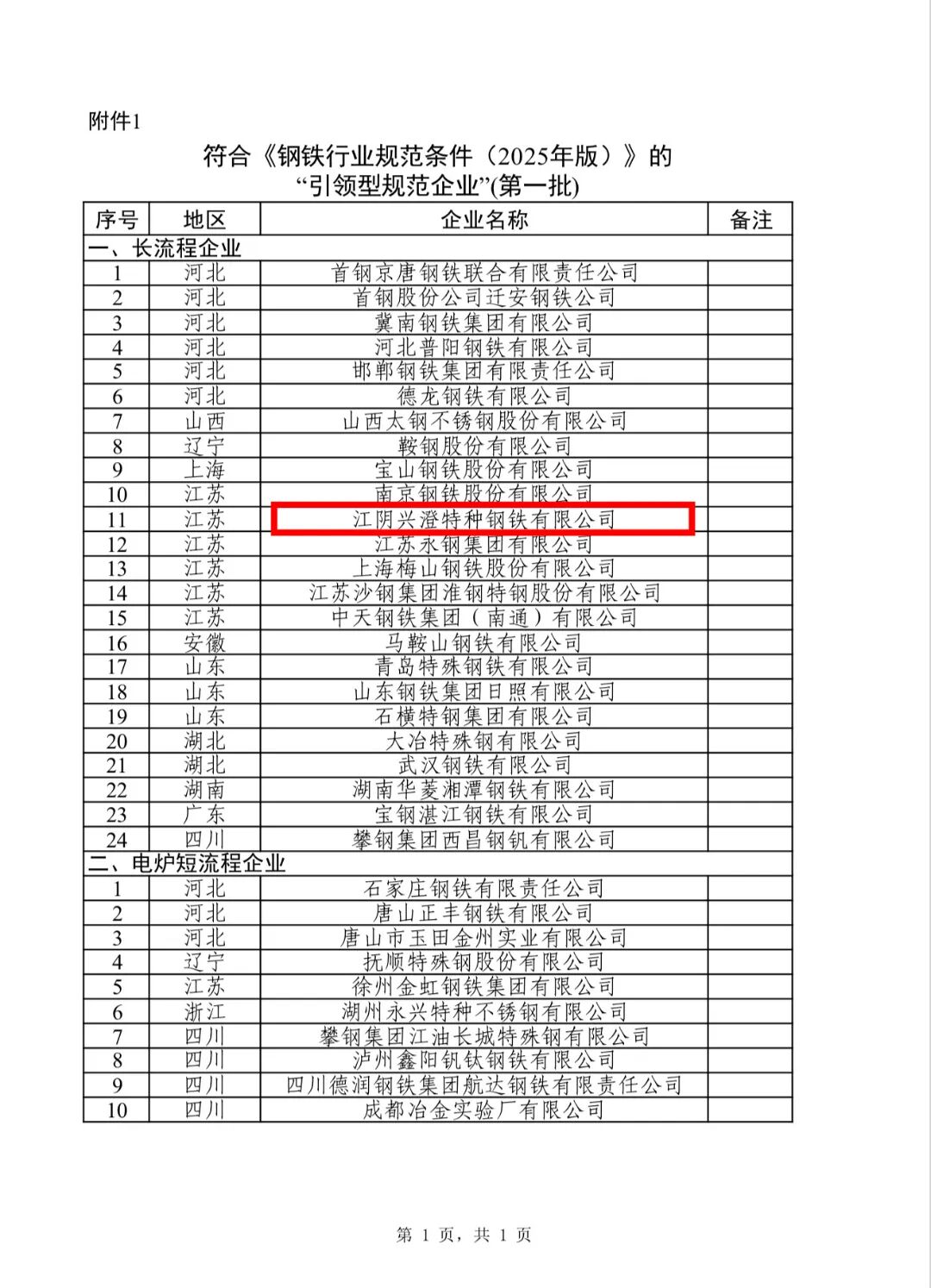 近日,国家工信部发布关于符合《钢铁行业规范条件(2025年版)》企业第一批公告名单,包含引领型规范企业34家、规范企业197家。江阴兴澄特种钢铁有限公司凭借卓越的综合实力成功进入第一批“引领型规范企业”名单,这既是对公司在科技创新、数智赋能、绿色安全等方面扎实成果的肯定,更标志着公司规范运营水平与核心竞争力已跃升至标杆水平,成为推动行业高质量发展的中坚力量。